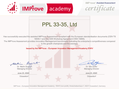 ООО "ППЛ 33-35", участник АССОЦИАЦИИ «УКРВНЕШТРАНС», по приглашению Европейской Сети Предприятий (Enterprise Europe Network - EEN [i]) приняли участие в исследовании по оценке уровня развития системы управления предприятием по специализации «Анализ инновационного потенциала». Исследование проводилось Европейской академией по управлению инновациями -IMP³rove Academy [ii]. Целью исследования является повышение конкурентоспособности предприятий малого и среднего бизнеса.